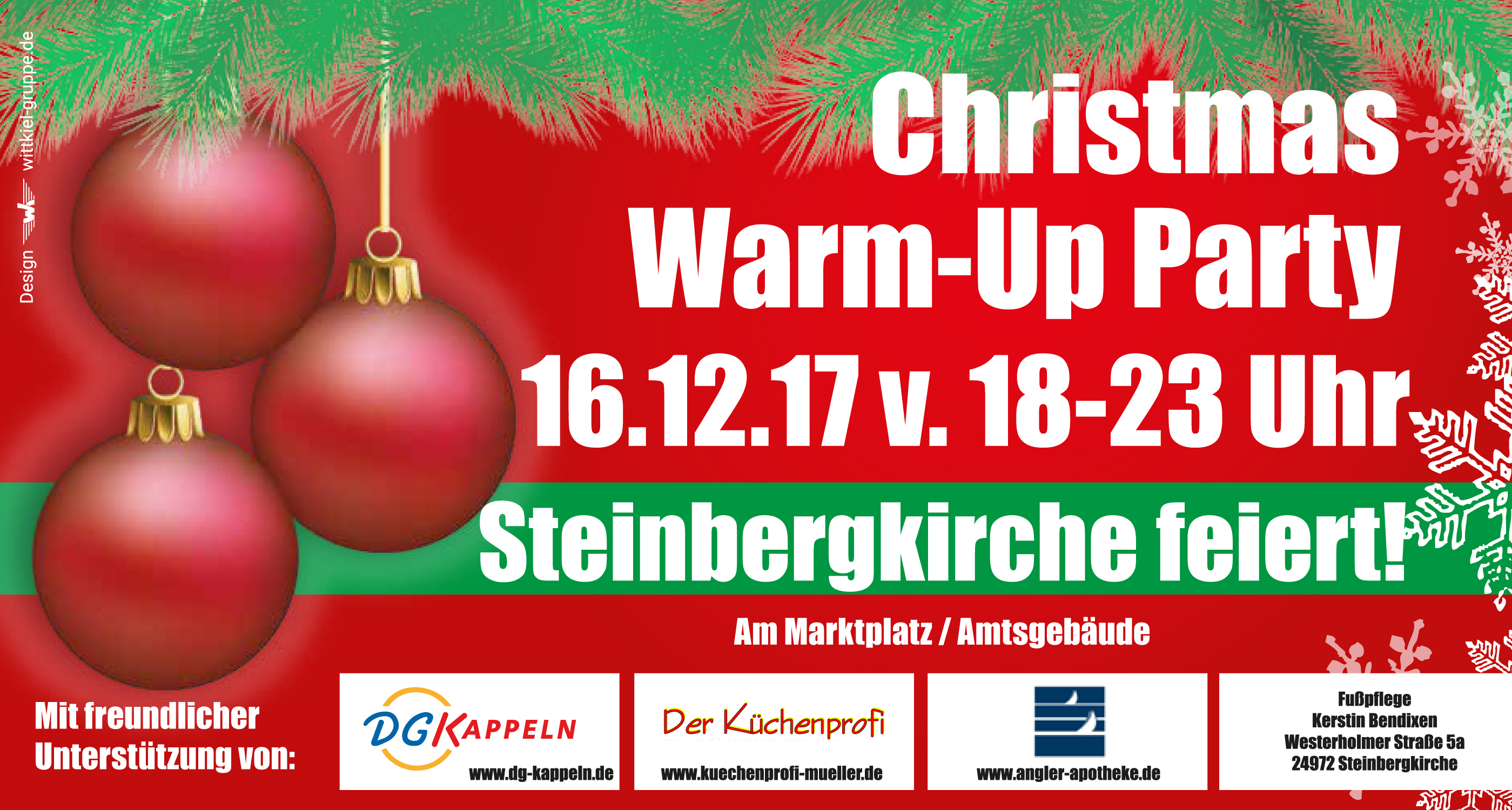Am Samstag, dem 16.Dezember, am Abend vor dem Steinbergkirchener Weihnachtsmarkt,  gibt es erstmalig auf dem Marktplatz (Holmlück) eine Christmas Warm-Up Party.
