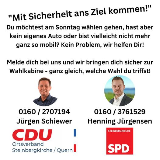 Solltet ihr Schwierigkeiten haben zur Wahl zu kommen, dann meldet euch bei uns! Egal wen du wählst! Wir bringen Dich sicher zur Wahl und wieder nach Hause!