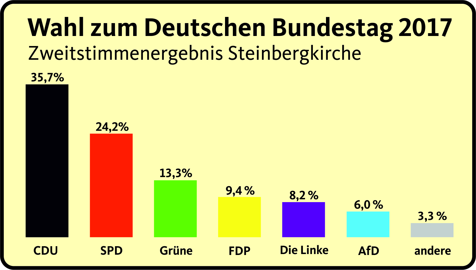 Steinbergkirche widersetzte sich bei den Zweitstimmen dem Bundestrend, und stattete die großen Parteien mit einem besseren Ergebnis aus (siehe Grafik).